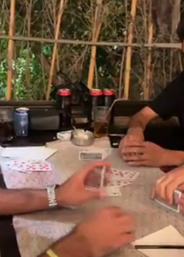 four men sitting at a table playing cards outdoors. The table is covered with a printed cloth and littered with playing cards, drinks in glasses, open cans of Coca-Cola and Pepsi, straws, and ashtrays. The man in the center has a silver watch on his left wrist. Behind the men is a fence made of bamboo-like reeds. The video is a close-up shot taken from the side of one of the men playing. The atmosphere seems casual and relaxed.