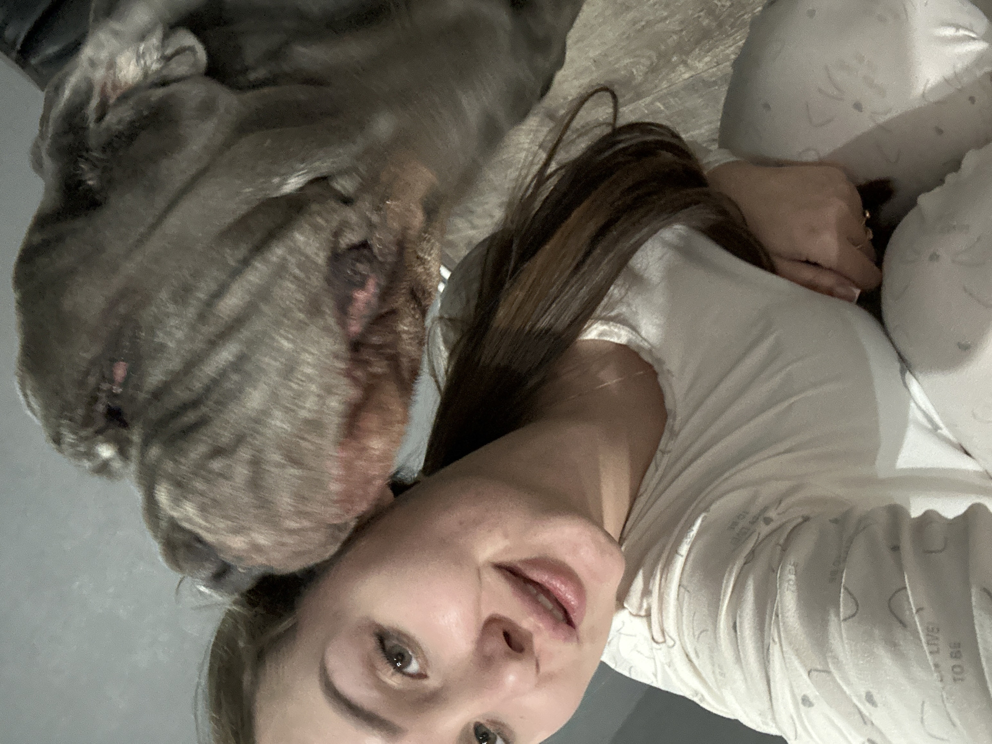 A woman is seen in a close-up shot, lying on a bed or similar soft surface, as indicated by the patterned fabric. A large gray dog is positioned near her head, possibly interacting with her. The environment appears to be an indoor space, possibly a bedroom. There is no specific information to suggest the location is in Ludorvay, Russia.