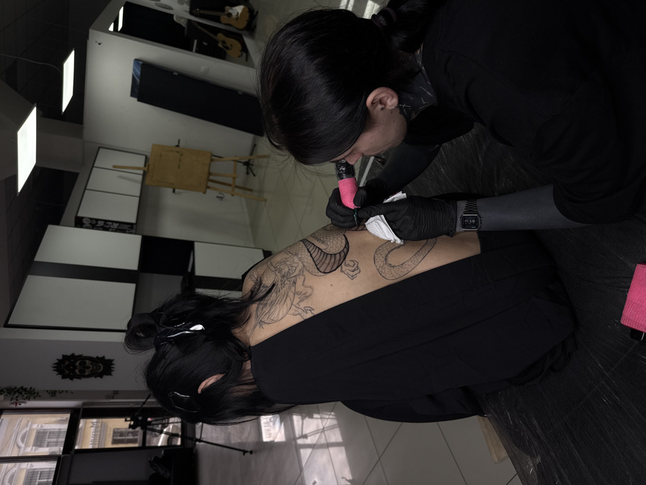 The image depicts an indoor scene within a tattoo studio, located in an urban area of Rostov-on-Don, Russia, indicated by the classical architecture visible through a large window. Two individuals are present. A female client, with dark hair secured with two white clips, is seated facing away from the camera, exposing her upper and mid-back. She is wearing a black, backless garment. A large, detailed outline of a dragon tattoo spans her upper and mid-back, with initial shading evident on a segment of the dragon's body. A female tattoo artist, with dark hair tied back, is actively working on the client's back. She wears a black short-sleeved top, black disposable gloves, and a dark digital watch on her left wrist. Her left arm exhibits a blackout tattoo, and multiple piercings with a small cross earring are visible on her left ear. She holds a pink rotary tattoo machine in her right hand, applying ink to the client's mid-back. Her left hand holds a white disposable cloth, used to wipe the tattooed area. The studio environment is brightly lit by ceiling-mounted fluorescent panels and natural light from the large window. The walls are predominantly white, and the floor is light-colored tile. In the background, a wooden easel stands, and two acoustic guitars lean against a wall. White upper cabinets with dark lower sections line a back wall. A dark decorative skull or mask is mounted on a wall near the window. A black tripod is visible near the window, pointing towards the street. The exterior view through the window shows a multi-story building with arched windows and light-colored classical architectural features, alongside a vehicle on the street, consistent with a city center. The surface the client is seated on is covered with black material, and a small pink towel or wrap is visible near the bottom edge of the frame.