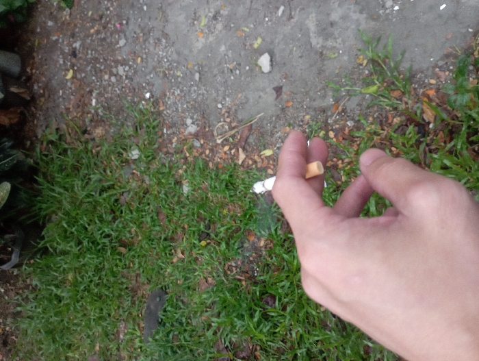 A person's right hand is holding a cigarette that is lit and smoking. The hand is on the edge of a dirt path. The path is surrounded by a patch of lush, green grass. The path has small stones and debris scattered about. The location is a residential area in the City of Meycauayan, Philippines, at the coordinates latitude: 14.772, longitude: 120.99. The hand is in focus, while the grass and path are out of focus. The background is a blur of green grass and other foliage. The cigarette is partially visible in the image and is in the foreground. The hand is holding the cigarette in the center of the image. The lighting is dim and there is some haze in the air.