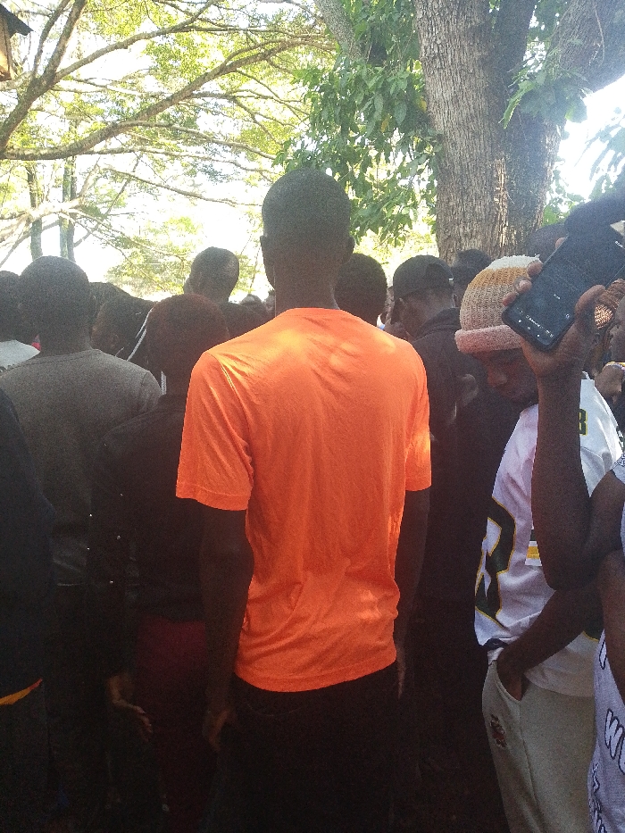 The image depicts a crowded outdoor scene in Bondo, Kenya, under natural daylight conditions. The primary focus is on the back of an individual standing centrally, wearing a bright orange short-sleeved t-shirt and dark trousers. This person has dark, closely cropped hair. Surrounding this individual is a dense gathering of other people, most of whom are also seen from behind or from the side, obscuring their faces. Among the discernible individuals in the crowd: - To the immediate left of the central figure, another person is visible in a grey t-shirt, also facing away. - To the right, an individual wears a white shirt with green or yellow markings, possibly a sports jersey, and light-colored pants. Their right hand is partially visible, appearing to be in a pocket. - Further to the right, a dark-skinned arm is extended upwards, holding a black smartphone with an active screen, suggesting photography or video recording. - Below the smartphone, another person wears a light-colored knit beanie with horizontal orange or brown stripes, and appears to be looking downwards. The environment consists of overhead tree branches with green leaves and a prominent tree trunk on the right side of the frame, indicating a shaded or partially shaded outdoor area. The lighting is bright, consistent with daytime. No specific interactions are clearly visible beyond the general gathering of individuals and one person holding a smartphone.