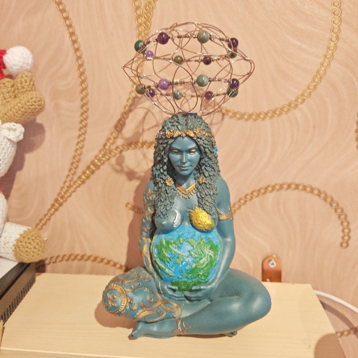 The scene, located in Rostov Veliky, Russia, displays a teal-colored statue of a seated, pregnant female figure positioned on a light-toned wooden shelf. The statue features long, braided hair adorned with a golden floral crown and other golden embellishments, including a necklace, arm bangles, and intricate patterns on her legs. A silver crescent moon emblem is visible below her left breast, and a golden sunburst emblem below her right. Her prominent pregnant belly is depicted as a globe of Earth, with blue oceans and green landmasses, over which her hands rest. A spherical wireframe structure, constructed from thin metallic wire and containing small, round purple and green gemstone beads, is balanced on the figure's head. The background consists of a wall covered in light-colored wallpaper, featuring a repeating pattern of intertwined golden chain links. To the immediate left of the statue, partially visible crocheted or knitted decorative items, one with red and white elements, are present. A silver-colored metal bracket is affixed to the wall on the right, with a white electrical cable visible beneath it.