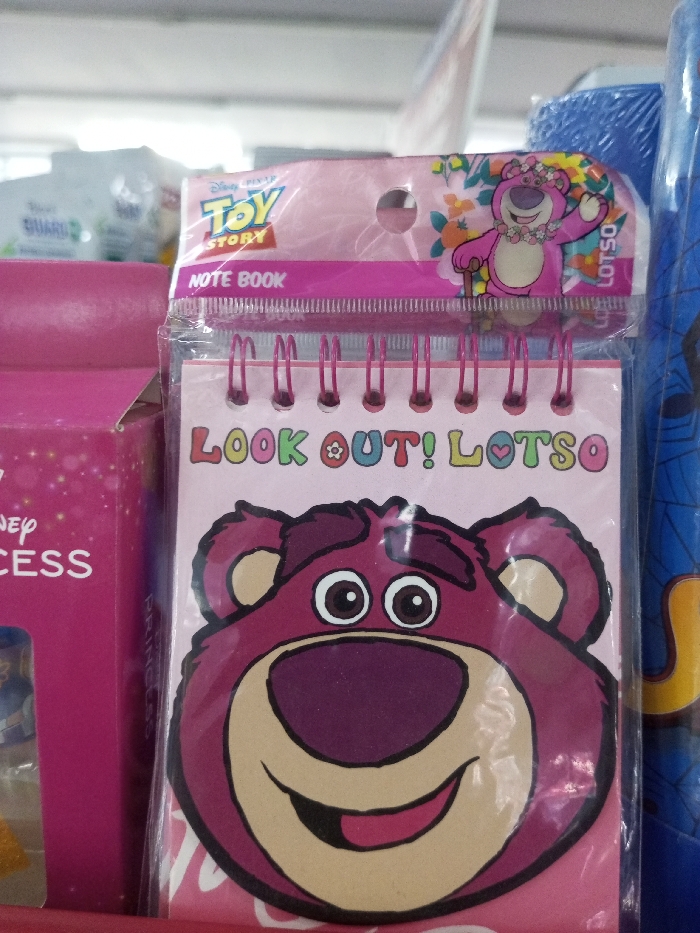 A pink, spiral-bound "Toy Story" notebook featuring Lotso is visible