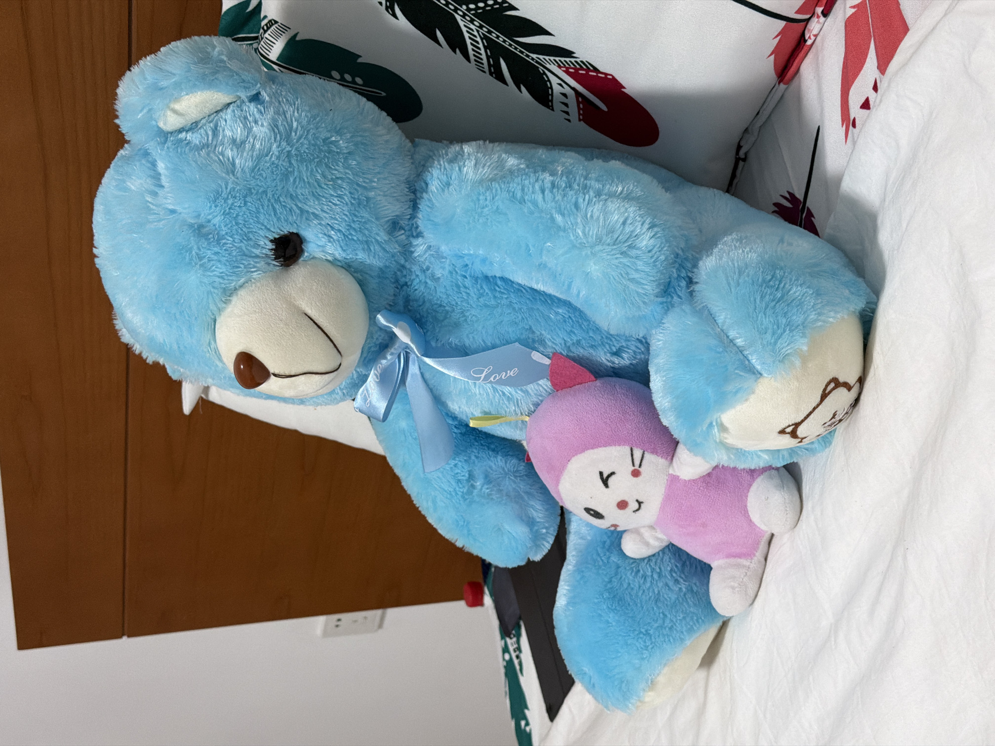 A blue teddy bear with a tan snout and a ribbon that reads "Love" is lying on a bed. A smaller pink and white stuffed animal is nestled under the bear's arm. The bed has white sheets and a pillow with a feather pattern. Part of a wood-paneled wall is visible in the background. The location is in Jiangning District, China.