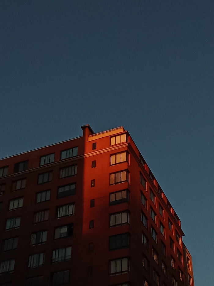 - "A tall, reddish-brown building dominates the lower half of the frame, its facade marked by rows of windows catching the warm light" by FM-Luk4a2, licensed under CC BY 4.0