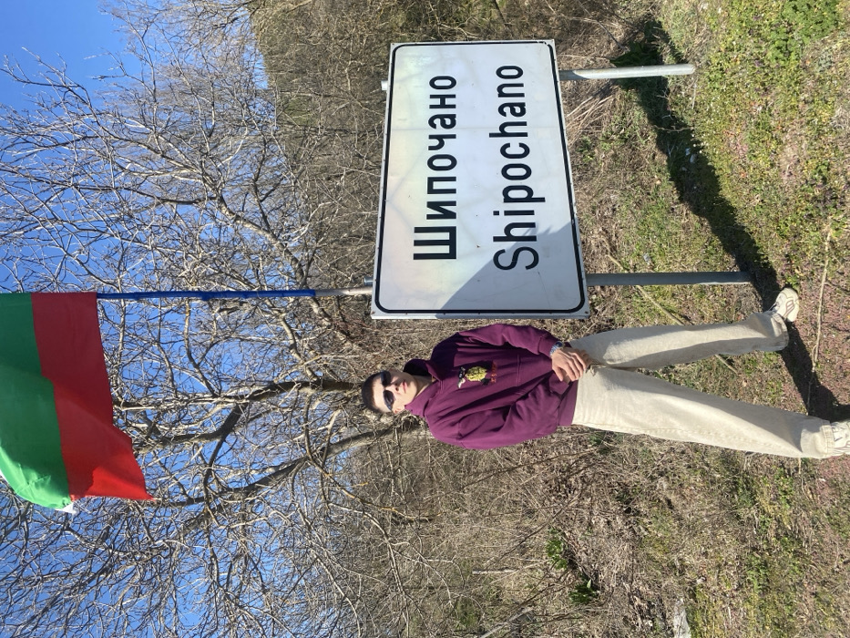 An individual stands outdoors on a sunny day in Shipochano, Bulgaria, positioned near a town sign