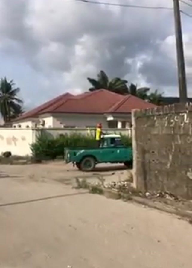 green pickup truck driving down a sandy road in a residential area. A man is standing in the back of the truck, holding onto the roof. The truck drives past a white house with a red tile roof and a gray brick wall. The road is sandy and has tire tracks. The sky is cloudy.
