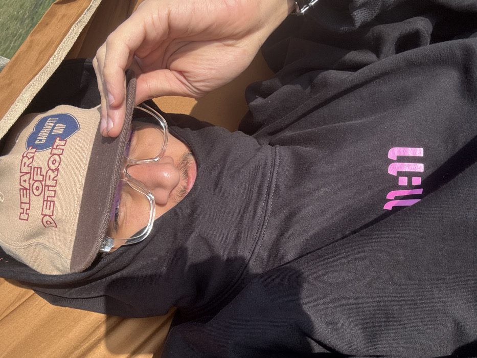An individual is depicted in a close-up, upward-angled shot, reclining in an outdoor setting in Sofia, Bulgaria. The subject wears a black hooded sweatshirt featuring a pink "11:11" graphic on the chest, a beige baseball cap with a brown brim displaying "HEART OF DETROIT" and "CARHARTT WIP" branding, and clear-framed glasses. A mustache is visible above the subject's upper lip. The subject's right hand holds the brim of the cap. A silver-colored chain is present on the left wrist. The individual rests on a light brown fabric surface, with bright sunlight casting prominent shadows. Green foliage is faintly visible in the upper right background.