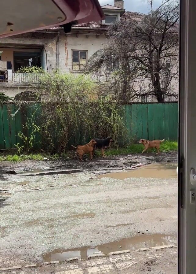 From an indoor vantage point, the camera shows an outdoor scene on an overcast day. Three dogs - two brown and one black - are in a muddy area bordered by a green fence and a dilapidated two-story house. The dogs initially stand near some bushes, then one brown dog approaches the black dog and they appear to engage in play, with the other brown dog joining in briefly. The black dog then moves forward, followed by the brown dogs, with one brown dog stopping to sit. The ground is wet with puddles, and the surface appears to be a combination of dirt and cobblestone. The house in the background is visibly weathered, with peeling paint and an unkempt balcony. The overall scene appears somewhat neglected.