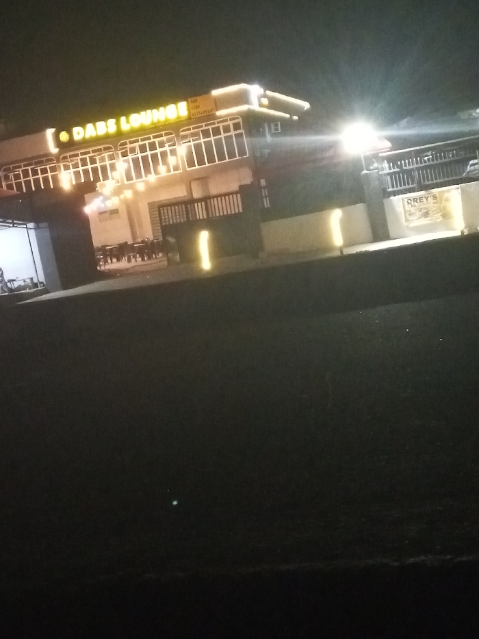 The image depicts a nighttime scene in Lokoja, Nigeria, showcasing two brightly lit commercial establishments. The dominant structure is a two-story building featuring prominent yellow LED strip lighting along its roofline and facade, with additional string lights illuminating its front. A large sign on the upper level clearly reads "DABS LOUNGE" in illuminated yellow letters. Below this, a smaller yellow sign, partially obscured, appears to indicate "BAR CLUB RESTAURANT." On the ground floor, an outdoor seating area with multiple dark tables and chairs is visible. To the far left, an open-sided annex structure is present. To the right of the main building, a dark-railed section, likely a fence or balcony, adjoins a lower, light-colored wall. On this wall, a second brightly illuminated sign is visible, displaying "DREY'S" in large letters with smaller, indistinct text beneath, likely indicating a type of eatery. The foreground consists of a dark, undifferentiated surface, possibly a road or open ground. No individuals are discernible within the frame. Significant lens flare and light streaks are present, originating from the intense artificial light sources.