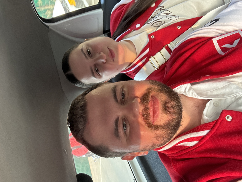 This image depicts two individuals, a male and a female, seated within the rear passenger compartment of a vehicle, captured in what appears to be a selfie. The male, positioned on the left, has fair skin, a dark beard, a mustache, and short dark hair. He wears a white collared shirt beneath a red varsity-style jacket with white striped cuffs and collar. A white, angular "K" logo is visible on the wearer's right sleeve. Direct sunlight illuminates the right side of his face and jacket, and he looks towards the camera with a slight smile. The female, positioned on the right, has fair skin and dark hair pulled back from her face. She wears a white t-shirt with a dark, stylized graphic, covered by a red varsity-style jacket matching the male's, complete with white striped cuffs and collar. A white cross-body strap with gold-colored hardware is visible over her jacket. She looks towards the camera with a subtle smile. The vehicle's interior features a gray headliner and white plastic trim around the rear window. Through the vehicle's rear window, an outdoor scene is visible. Behind the male's head, a blurred individual in a bright orange or red vest/jacket is partially observed, appearing to be outside the vehicle. Beyond this, blurred green foliage and an indistinct light brown ground area are present. To the right, through the rear window, more blurred green foliage and a white object with a yellow stripe are visible. The specific location within Bhopal, India, cannot be identified from the visual data in the image.