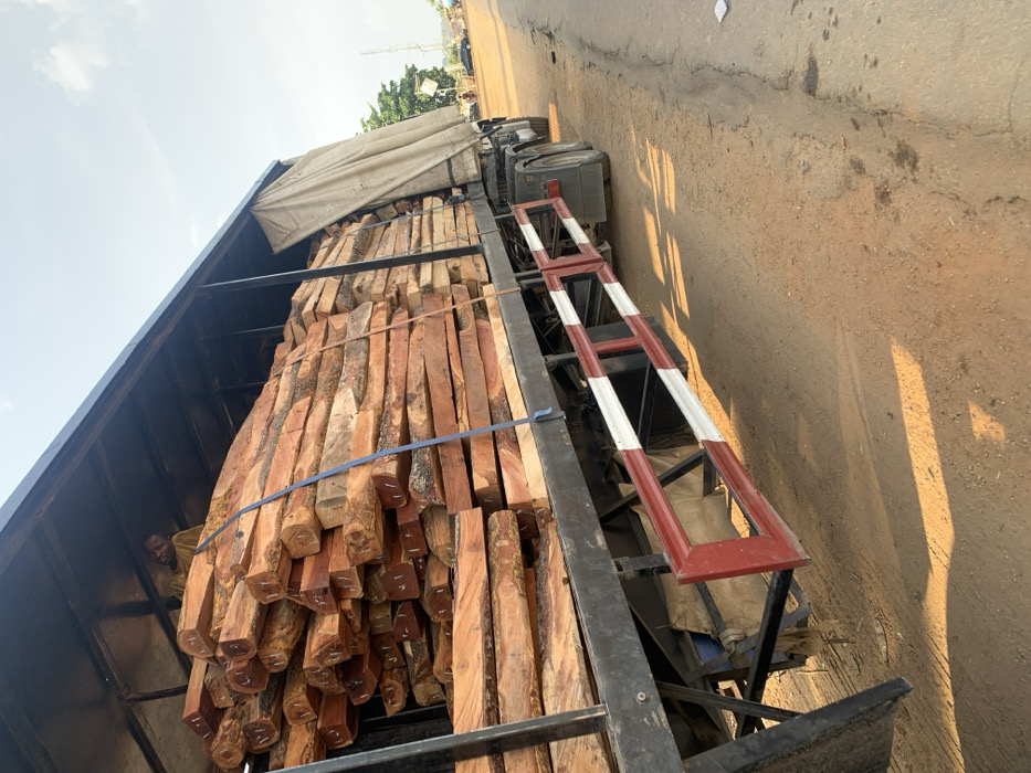 A truck bed is loaded with stacks of rectangular, unfinished wood planks. The wood is a reddish-brown hue and secured with a light blue strap. A red and white striped barrier flanks the side of the truck. The truck is parked on a paved road, casting a long shadow. A tarp covers the front portion of the load. A person's face is visible, peering out from the wood pile.