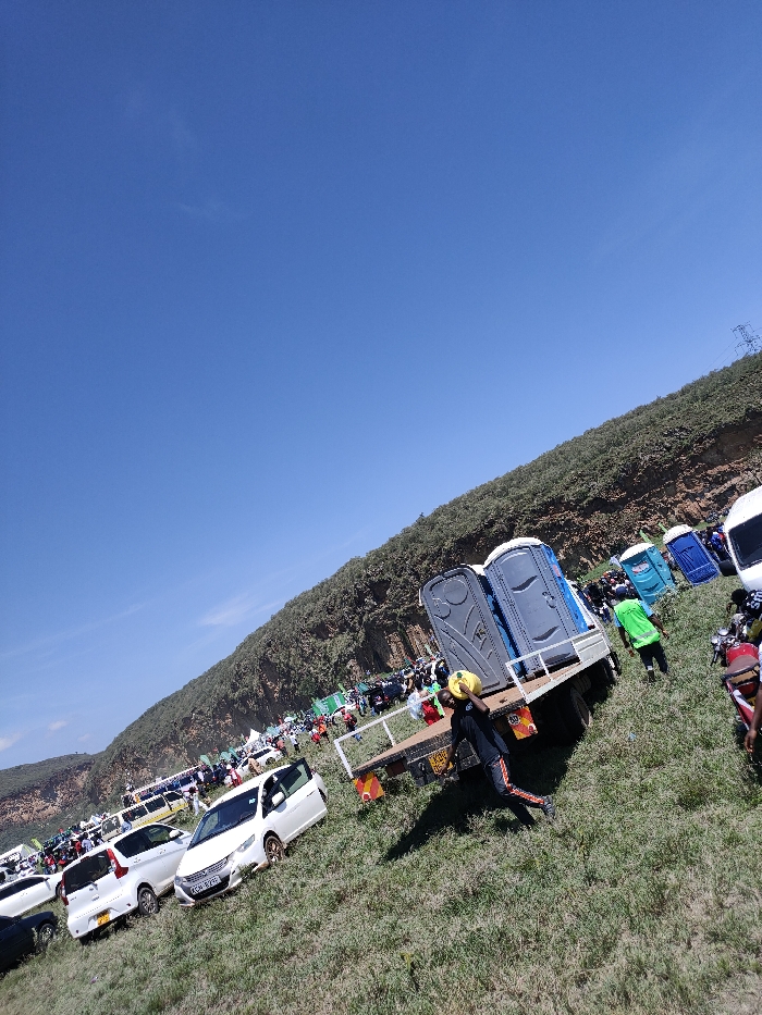 A wide-angle, tilted photograph captures an outdoor gathering in Olkaria ward, Kenya, under a clear blue sky. The scene is dominated by a large, grassy field that slopes gently upward from the foreground toward a steep, heavily vegetated hillside in the background. In the immediate mid-ground, a white flatbed truck is parked facing away from the viewer, carrying two grey portable toilets with white doors. License plates are partially visible on the truck's rear, along with a red '80' sticker. To the right of the truck, a person wearing a dark shirt, dark pants with red stripes, and a yellow protective helmet or hat walks left across the grass, carrying a yellow container in their right hand. Their shadow is visible on the grass to their left. Numerous other vehicles, including several white cars (one with license plate KCH 829K) and motorcycles, are parked on the grassy field, extending into the mid-ground and background. A large crowd of people is gathered further up the slope, many individuals wearing green apparel. More portable toilets, some blue and white, are visible among the crowd near the base of the hillside. High-voltage power lines and a pylon structure are discernible on the distant, tree-covered ridge to the right. The overall environment suggests a sunny day with distinct shadows cast by subjects and objects.