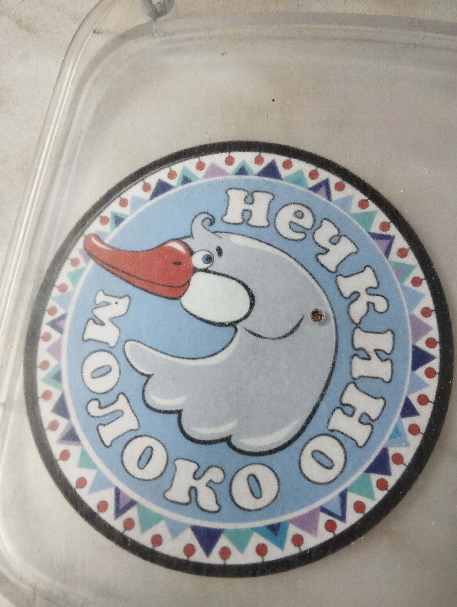 A close-up, top-down view depicts a circular sticker, approximately 10-12 cm in diameter, resting inside a clear, translucent plastic container, in Krasnogorskoye, Russia. The sticker features a light blue central field showcasing a cartoonish white-bodied goose with a prominent red beak and a small blue-pupiled eye, oriented in profile facing left. White capital letters with black outlines spell "Нечкино" (Nechkino) in an arc above the goose and "МОЛОКО" (Moloko), meaning "Milk," in an arc below it. The sticker's outer circumference is adorned with a patterned border consisting of alternating white, light blue, and light purple triangles interspersed with small red dots, all outlined in black. The outermost edge of the sticker is a solid black band. Minor surface imperfections include dust particles and a small dark speck located near the goose's neck. The container rests on a uniform light gray, slightly mottled surface, likely a countertop or table.