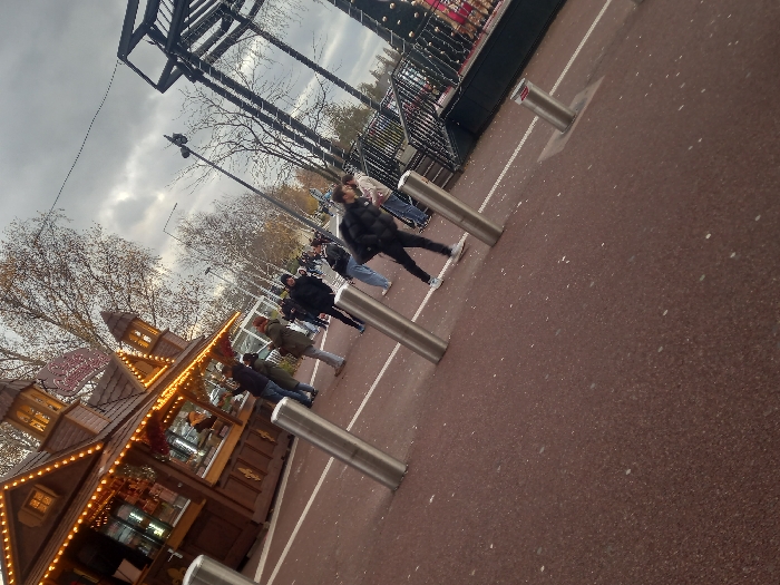 A sideways shot shows a street scene with people walking by a wooden structure adorned with lights. The structure is a vendor's booth. Silver bollards line the walkway, separating it from a red-paved area. Bare trees and a grey sky form the backdrop. A tall, dark metal structure is visible in the distance.