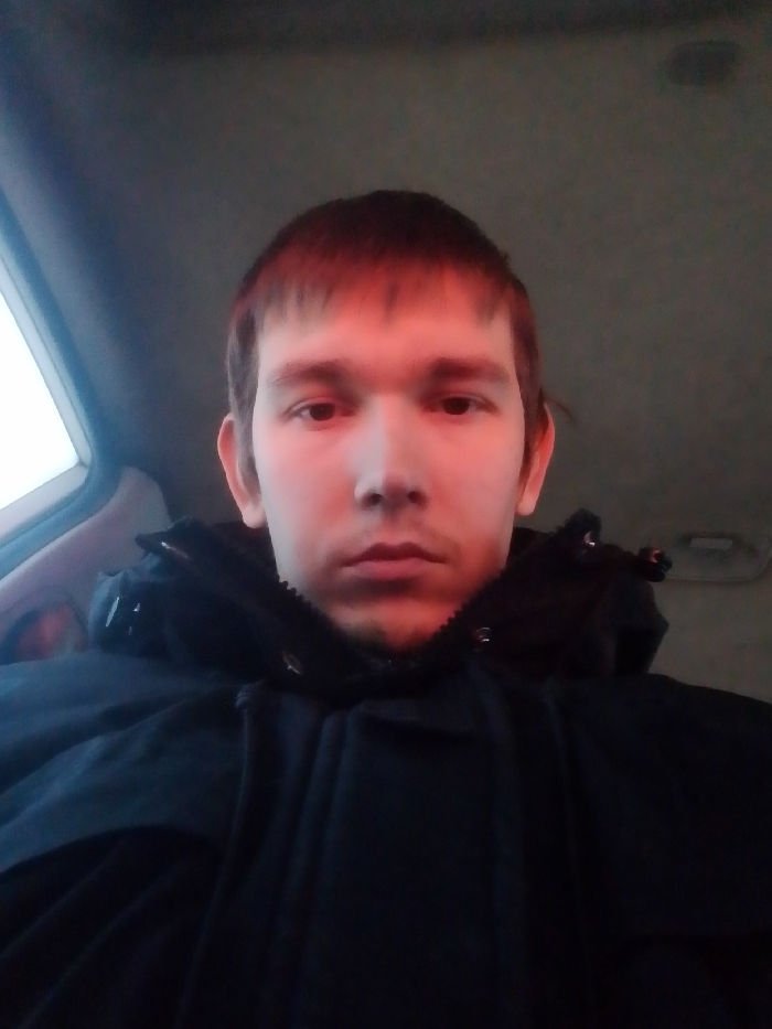 headshot of a single individual, appearing male, with fair skin, short brown hair, and a neutral expression, looking directly into the camera. The face is illuminated primarily by a reddish-orange light source, casting a distinct hue across the forehead and upper face. The individual wears a dark, likely black, winter jacket with a high collar featuring visible zippers and buttons. The setting is identified as the interior of a vehicle, with a light-colored ceiling visible overhead and a bright, overcast outdoor light discernible through a window on the left side of the frame. No specific urban or architectural details are visible within the image to confirm a location in Saint Petersburg, Russia; the scene is limited to the vehicle's cabin.