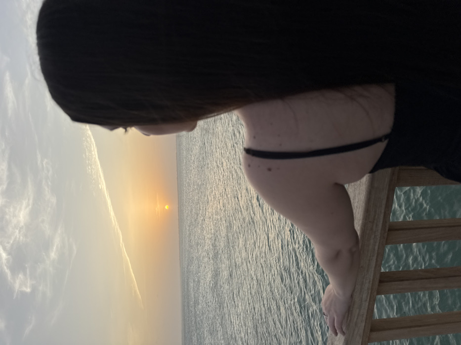 The scene depicts a sunset over a body of water in the city of Zanzibar, Tanzania. A person, viewed from behind and the right side, stands on a wooden pier or platform. The individual has long, dark hair and wears a dark, likely black, strap garment. Their right arm is bent, with the right hand, adorned with a ring on the fourth finger, resting on a weathered wooden railing. Several small moles are visible on the exposed right shoulder. The person's gaze is directed towards the horizon, where a distinct, bright orange sun is setting over the water. The sky above is a gradient from yellow-orange near the horizon to lighter blue, containing several wispy clouds and a prominent, linear contrail extending diagonally from the upper left. The water surface below shows gentle ripples and reflections.