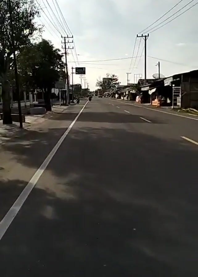 first-person view moving down a black asphalt road with a white line marking the edge. On either side of the road are various buildings, some appearing to be stores or small businesses, and others seemingly residential. Power lines are strung overhead, supported by utility poles. A few vehicles, including motorcycles and a truck, are visible in the distance. The sky is overcast, casting long shadows across the road.