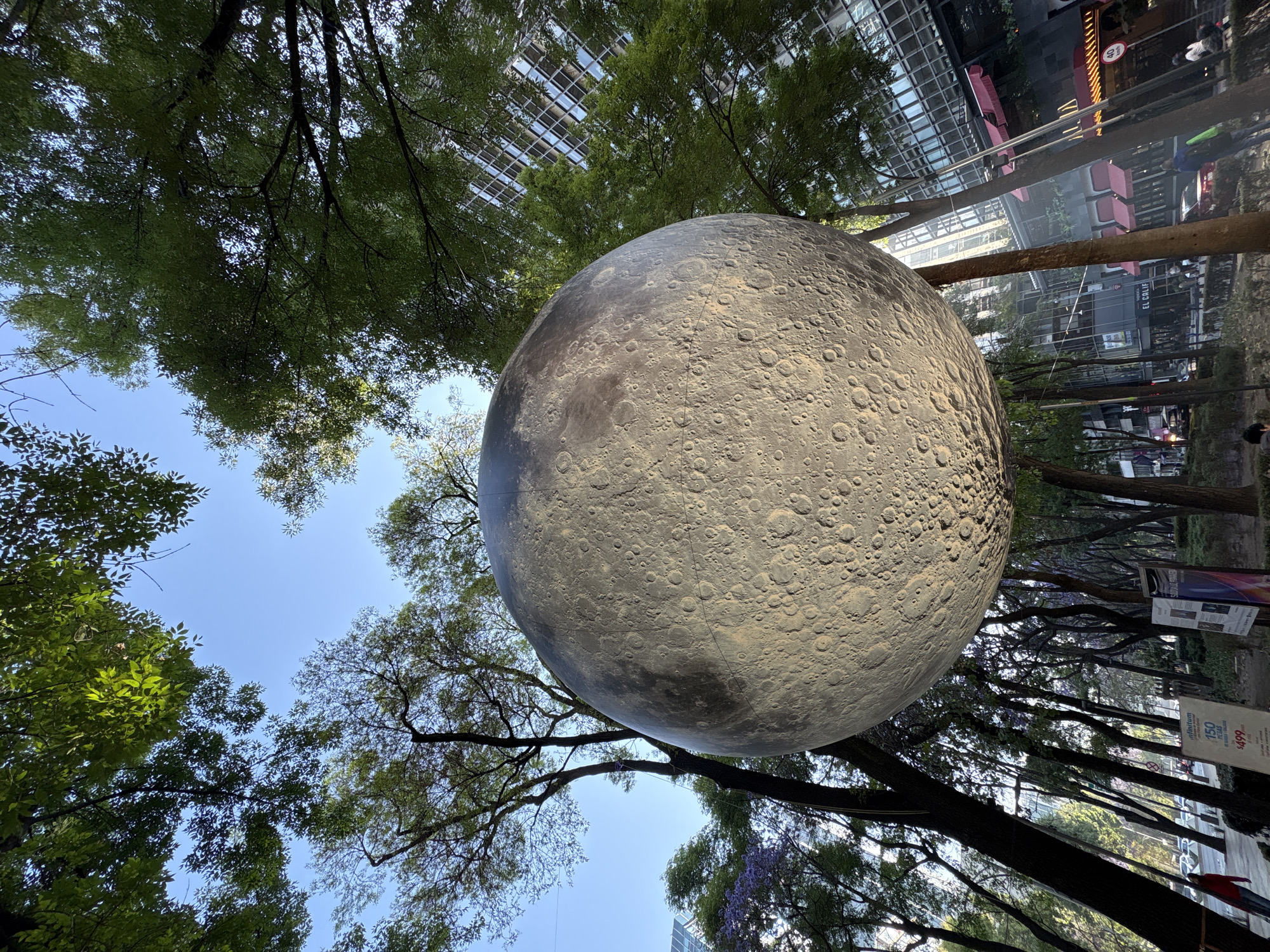 A large, detailed spherical replica of the Moon, textured with craters and maria, is centrally suspended outdoors under a clear blue sky. Numerous tall trees with green foliage, some displaying purple blossoms, frame the sphere and extend into the foreground and background. Through the trees, modern high-rise buildings with reflective glass facades and some with red awnings are visible. A street with vehicles and pedestrians is present on the left side of the frame. Informational placards are positioned on the ground; one partially visible sign includes the text "Infinitum," "150," and "$499," another reads "Sabor de la Primavera." A "40 KM/H" speed limit sign and a building sign reading "EL CALIF" are visible in the background. Several indistinct individuals are walking on sidewalks. The scene is located on Paseo de la Reforma, Mexico City, Mexico, likely near the Jardín de la Emperatriz.