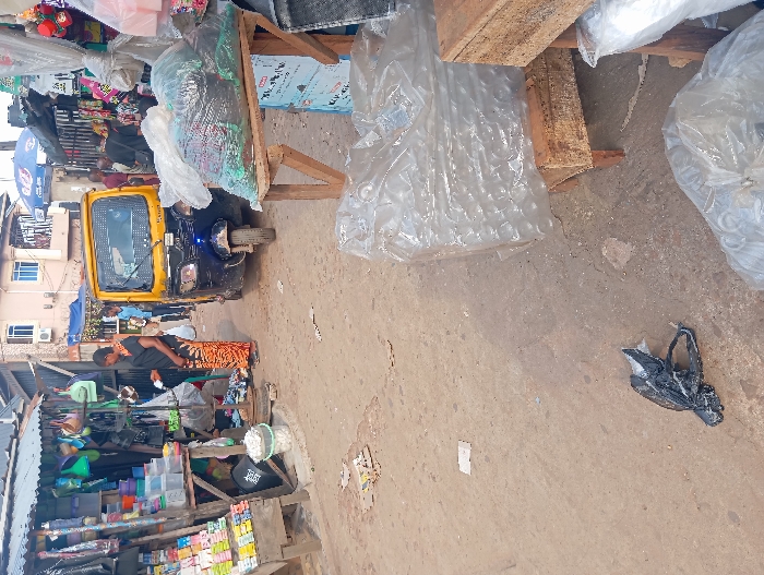 A bustling outdoor market scene with a yellow tuk-tuk. People and vendors are near small shops and stands laden with goods. Plastic bags and other merchandise are displayed on tables. The ground is concrete, with some scattered trash. The buildings in the background are two-story and feature white exteriors. The image is taken from an elevated perspective.