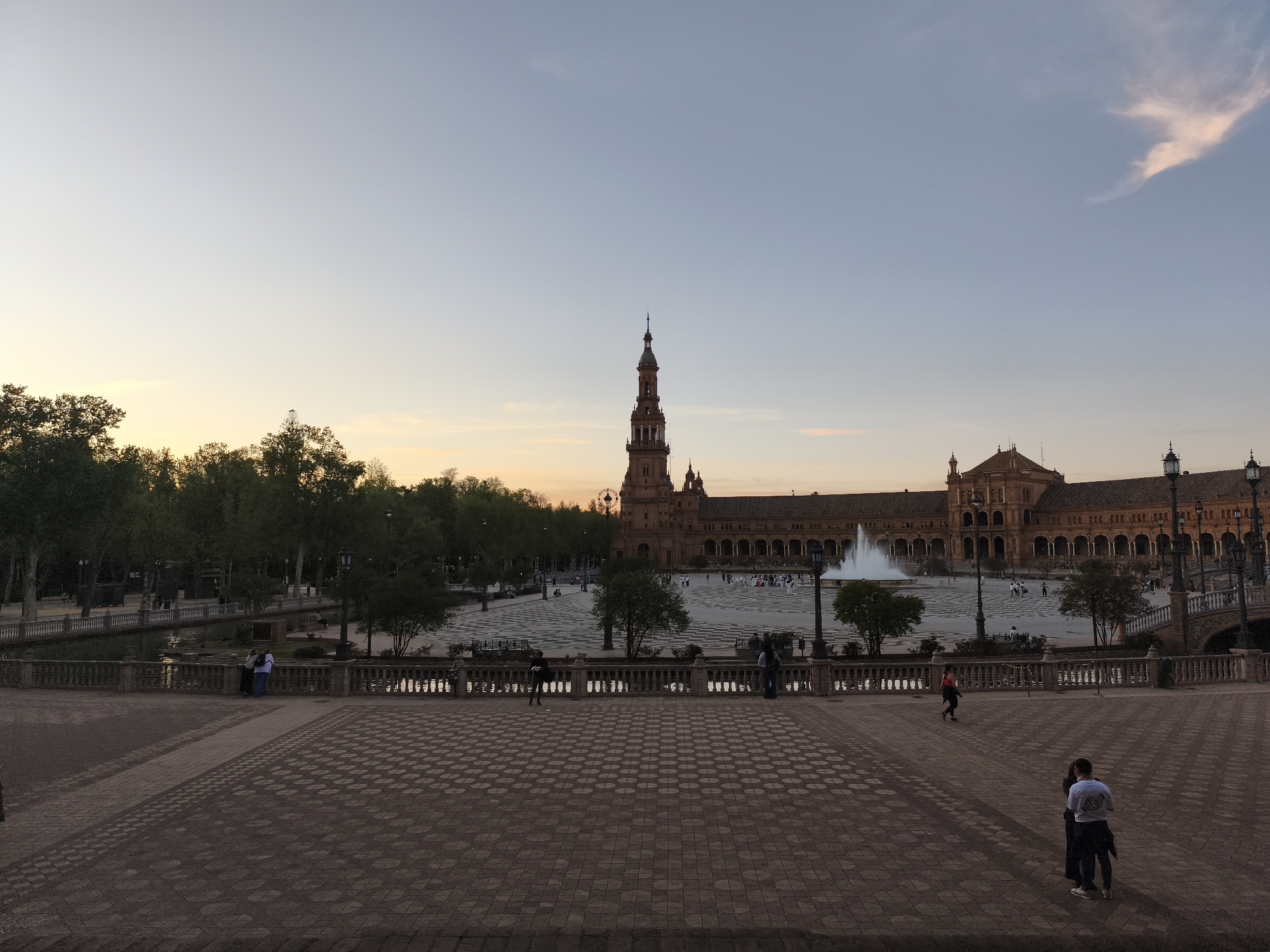 This image depicts the Plaza de España in Seville, Spain, during the late evening or dusk