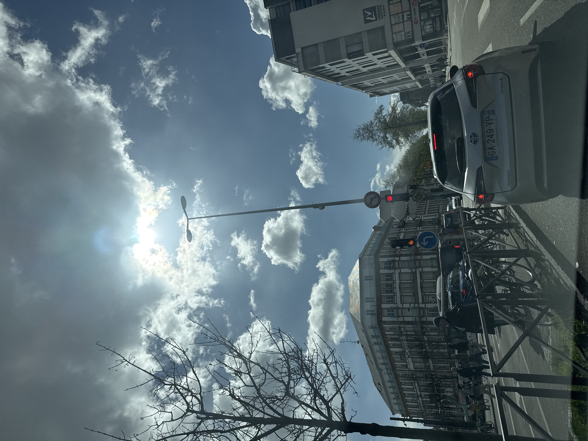 This is an outdoor urban scene captured during daylight hours in Strasbourg, France, from inside a stationary vehicle. The prominent building on the left, featuring a mansard roof and multiple stories, is located at 20 Rue des Magasins. To the right, a modern multi-story building with "LAGRANGE Appart'Hôtel" signage is visible. A silver Toyota Corolla Hybrid, bearing the French license plate GA-249-VP, is stopped directly in front of the observer's vehicle, with its brake lights illuminated. A red traffic light for straight-ahead traffic is visible on a tall street lamp pole in the center-left, accompanied by a blue circular sign indicating a mandatory left turn and a red circular 'no entry' sign. Pedestrians are visible on the left sidewalk, some walking near parked bicycles secured by a metal barrier. A bare-branched tree stands prominently on the far left. The sky is clear blue with scattered white cumulus clouds, and a bright sun flare is evident in the upper center, indicating a high sun position. Other vehicles, including a dark car and a dark van, are visible further down the street, along with what appears to be a tram or bus on the left.