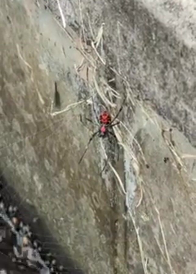 red-spotted spider hanging in its web against a grey, textured wall. The spider is black with red markings on its abdomen. The spiderweb is covered in dried grass and debris. The camera zooms in, focusing on the spider, making it appear larger and clearer. There is a blurred and moving mass at the lower left edge of the screen. A person is speaking in the background.