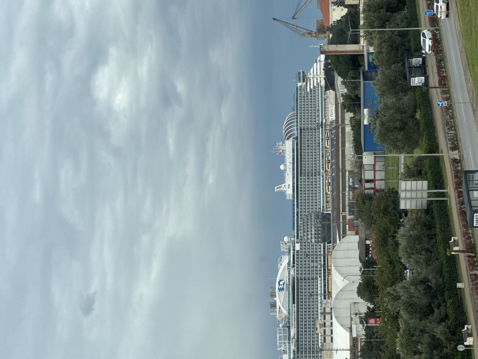 The image depicts a cityscape in Bar, Montenegro, dominated by a large cruise ship docked at the port. The ship, prominently displaying the Princess Cruises logo, towers over the surrounding infrastructure. Adjacent to the ship are port facilities, including cranes and industrial buildings. A road runs alongside the port, featuring greenery, sidewalks, parked cars, and advertisements. Overcast skies fill the upper portion of the image, suggesting a cloudy day.