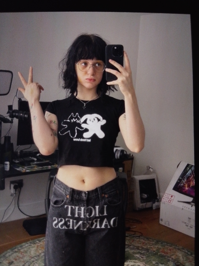 This image, appearing to be a photograph of a digital display, depicts a young female individual taking a mirror selfie indoors in Lares, United States of America. The subject, centrally framed, has shoulder-length dark hair with bangs and wears round, wire-rimmed glasses. Her expression is neutral with slightly pouting lips. She is dressed in a black, short-sleeved, cropped t-shirt featuring a white graphic of a cat and a rabbit with mirrored text below. Her lower garment consists of dark-wash denim jeans with vertically aligned, mirrored white text reading "THG IL" (LIGHT) on the left thigh and "SSENKRAD" (DARKNESS) on the right thigh. A silver-colored pendant necklace is worn. Tattoos are visible on both forearms. Her raised left hand displays a 'V' gesture, while her right hand holds a dark-colored smartphone, positioned to capture her reflection. The background behind the subject features a light-colored wall, a wooden floor partially covered by a patterned rug. To the left, a microphone on a boom arm and a desktop computer setup are present on a dark-colored desk. To the right, a CRT monitor and a white cardboard box, displaying an image of a monitor, are visible on the floor.