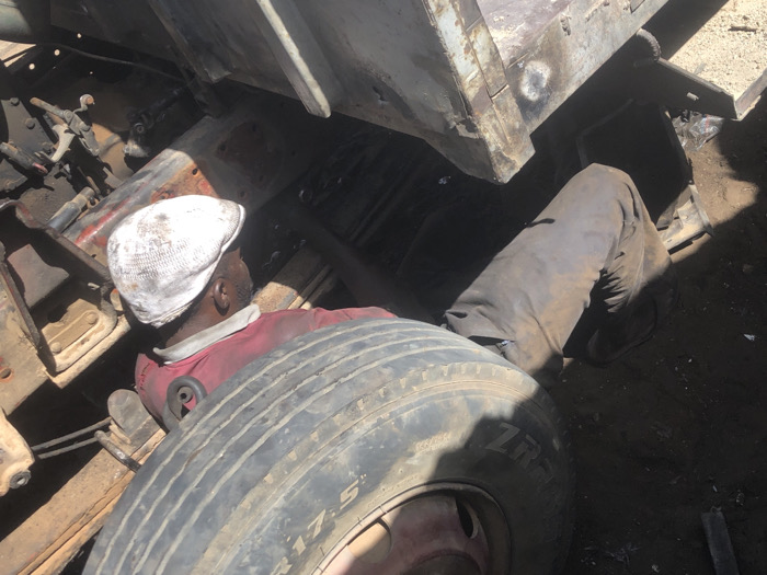 The scene, located in Tukur Tukur, Nigeria, depicts an individual engaged in mechanical work beneath a heavy-duty vehicle in an outdoor setting
