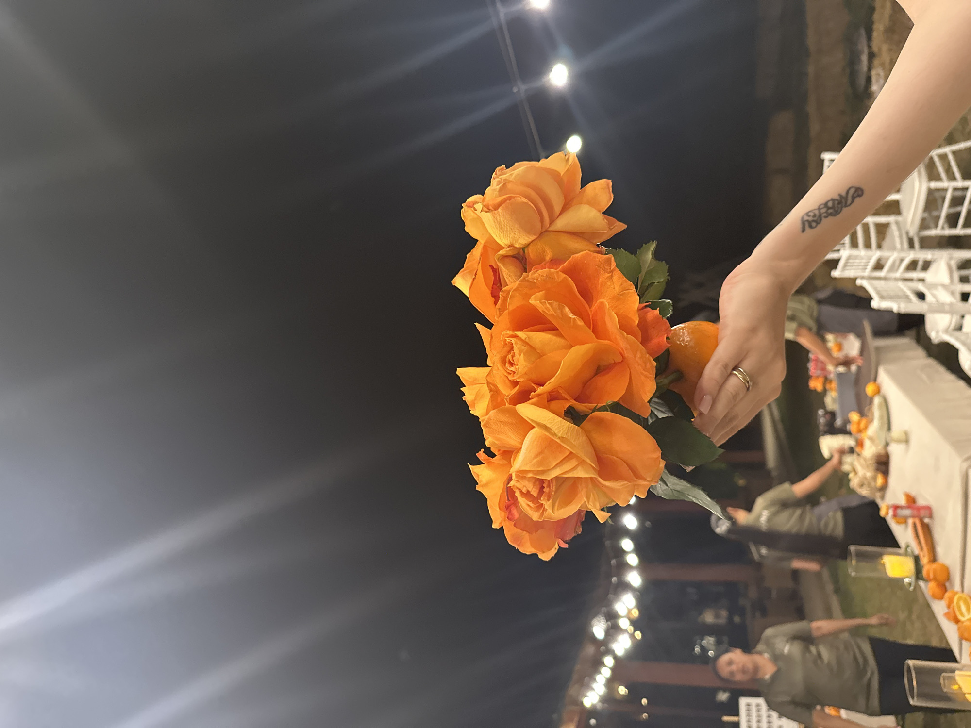 An outdoor nighttime scene in Si Sunthon, Thailand, features a foreground view of a person's light-skinned left hand holding a bouquet of approximately seven vibrant orange roses. The hand wears a gold-colored ring on the fourth finger, and a dark, abstract tribal-style tattoo is visible on the inner forearm. The roses are contained within a small, light orange vessel. In the blurred background, string lights are strung across an outdoor area, illuminating a gathering. Multiple individuals are visible, including at least two women in olive-green polo shirts and dark trousers, appearing to be event staff. One woman stands near a long table covered with a white tablecloth, displaying various items including sliced oranges, whole oranges, drinks in glasses, candles in clear holders, and other small food items or decorations. White event chairs are stacked or arranged to the right of the table. The overall environment is dark, indicating night, with artificial light sources providing illumination.