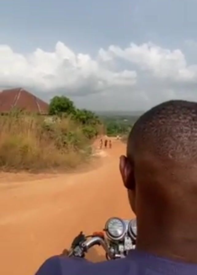 man riding a motorcycle down a dirt road. The road is red and dusty, and there are a few children walking ahead. The man is wearing a blue shirt. The sky is blue with some clouds. There is a house and vegetation on the left side of the road. The man is looking at the road ahead.