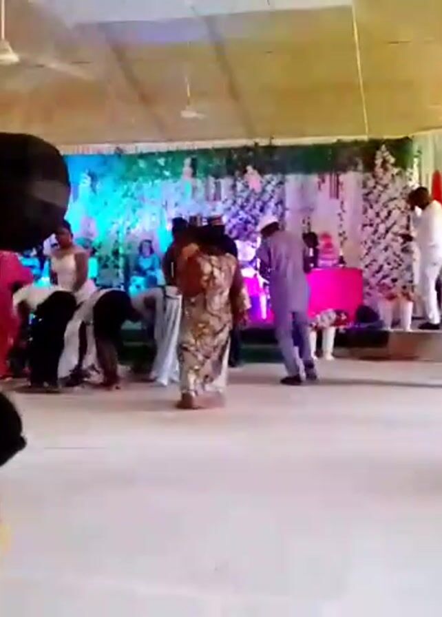 The video captures an indoor setting, likely a hall or event space, where a group of people is gathered. The room is decorated with red, orange, and white fabrics draped along the walls. A backdrop adorned with flowers and lights is visible at the far end of the hall, suggesting a stage or focal point. Several individuals are standing or moving around near the backdrop, possibly posing for photos. There is a table covered with a pink cloth, and a cake is sitting on the table. A large photographic lighting fixture is set up near the group. The floor is a light grey or white color. There are a few ceiling fans hanging from the ceiling. The camera is held by a person, visible from the neck down. The camera appears to be a mobile phone.