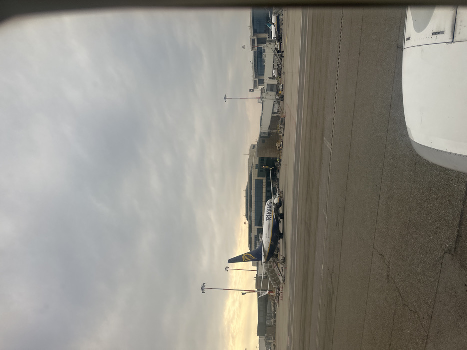 - "From an aircraft window, a Ryanair plane is stationed at an airport terminal under a cloudy sky" by FM-hAOA63, licensed under CC BY 4.0