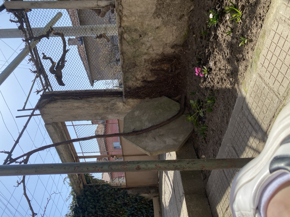 The image depicts an outdoor residential area in Mokrishte, Bulgaria, under bright daylight. In the lower-left foreground, a portion of a white and grey sneaker is visible. The immediate ground consists of square concrete pavers. A vertical, rusted green metal pole stands centrally in the foreground. To its right, a garden bed of dark, disturbed soil contains multiple small green sprouts, a cluster of fuchsia flowers, and a small white flower with a yellow center. A large, hexagonal concrete slab, weathered and light-colored, leans against a concrete support structure. A dark vine extends down from the top of this slab. The support structure itself is part of a larger concrete archway or entrance, exhibiting signs of age and organic growth at its base. Above the midground, a metal wire mesh fence or trellis is visible, supporting gnarled, bare grapevines. In the background, beyond the fence, residential buildings with tiled roofs and light-colored walls are present, including one with a reddish roof and a visible window. The sky is clear blue, and shadows are sharply defined.