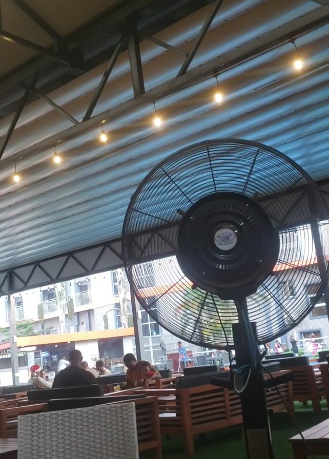 The scene appears to be an outdoor or semi-outdoor seating area, possibly a restaurant or cafe, with a corrugated metal roof supported by a metal frame. The roof has evenly spaced small lights running along its length. A large industrial-style fan hangs from the ceiling, providing air circulation. The seating arrangement consists of wooden benches and tables, and at least one white plastic chair is visible. People are seated at the tables, some appearing to be eating or conversing. The background reveals a view of a multi-story building with windows. Artificial turf covers the floor.