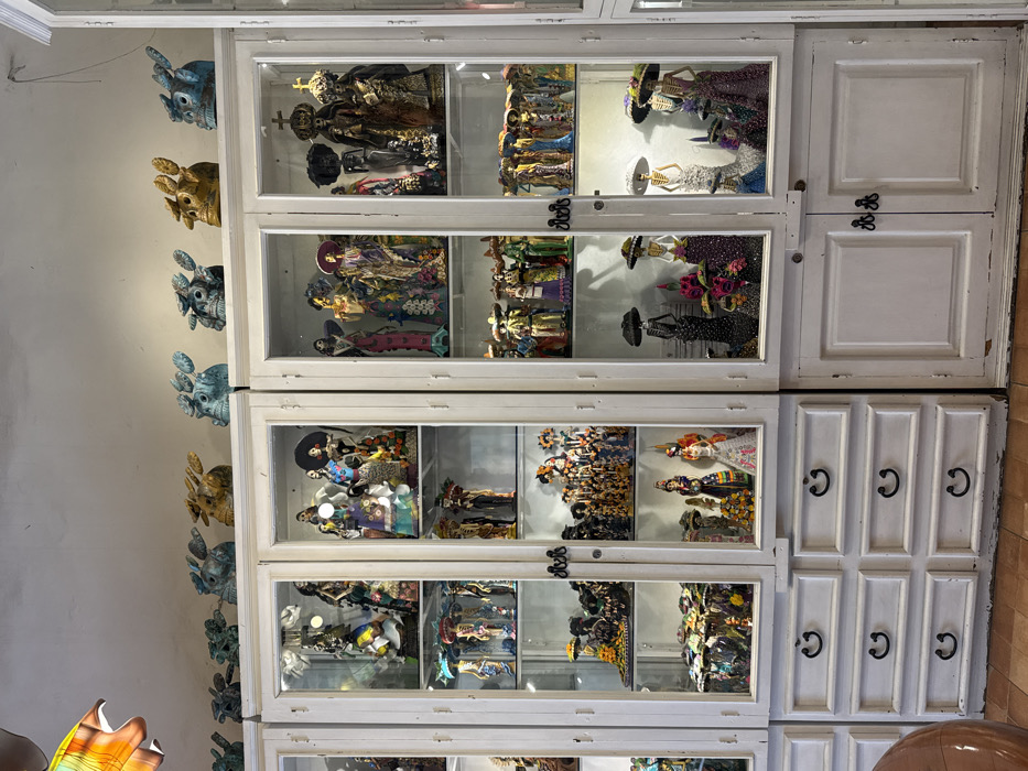 A white, ornate display cabinet stands against a light-colored wall, featuring four tiers of glass-fronted compartments. Each compartment is filled with colorful, handcrafted figures, particularly skeleton figurines dressed in vibrant attire. To the left of the cabinet, decorative masks are mounted on the wall, complementing the overall artistic display. A small chest of drawers is on the right of each tier.
