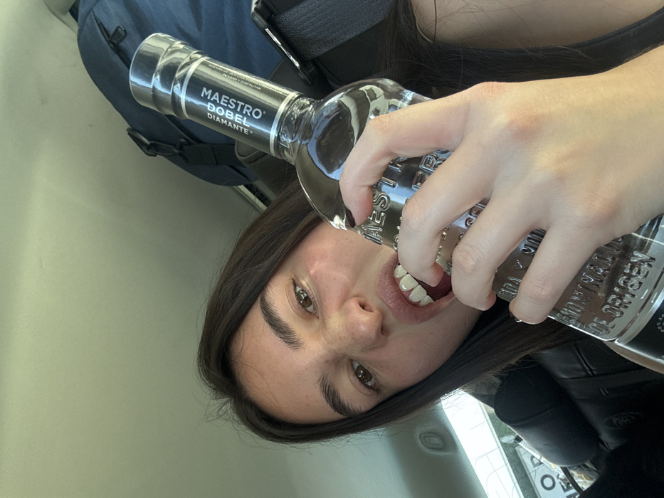 The image depicts the upper body of a female individual inside a vehicle, location Unknown, Unknown. She has dark brown hair, fair skin, and light brown eyes, visible in a close-up, upward-angled shot. Her mouth is open, revealing her teeth as she appears to interact with the neck of a clear glass bottle. Her facial expression shows a grimace, with the nose slightly scrunched. Her left hand, with dark-painted fingernails, tightly grips the bottle. The bottle is labeled "MAESTRO DOBEL® DIAMANTE" tequila. In the background, part of a dark-colored backpack, a car seat, and a seatbelt are visible, confirming the interior of a car. The lighting suggests daylight conditions.