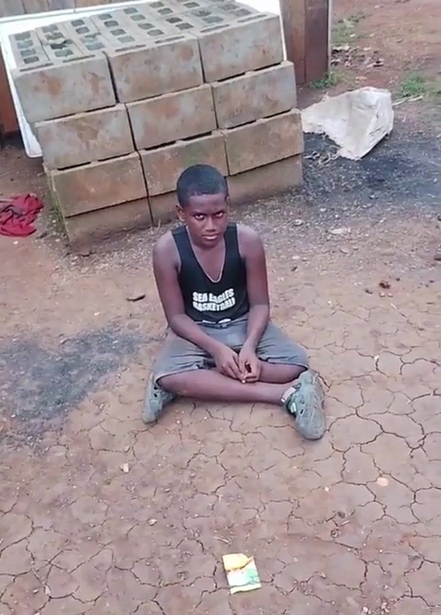 A young boy is sitting cross-legged on cracked dirt ground. He is wearing a black tank top with the words "SEA EAGLES BASKETBALL" on it, grey shorts, and green sneakers. His expression changes from serious to smiling. In front of him is a small, wrapped item on the ground. Behind him is a pile of grey concrete blocks, a piece of white plastic, and a corner of a wooden structure. A red piece of cloth is to his left. The background is blurred, suggesting an outdoor setting.