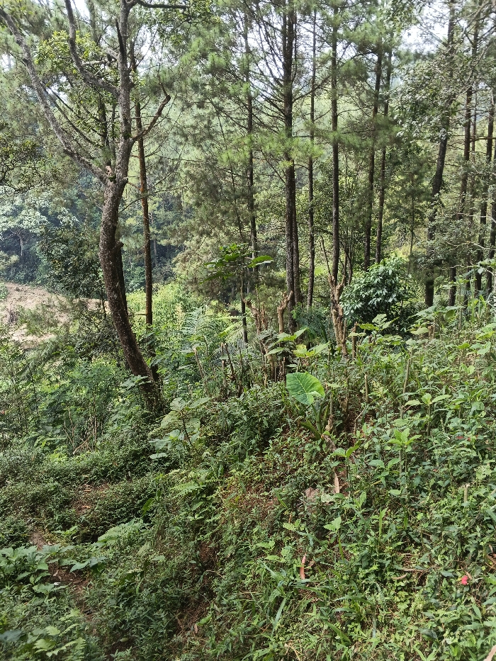 This image depicts a densely wooded area, identified as being within the city of Buyantashi, Zambia. The scene is dominated by a lush, green landscape, appearing to be a hillside sloping downwards from the viewer's perspective. Numerous tall, slender evergreen trees, consistent with conifers, rise vertically throughout the mid-ground and background, their needles forming dense canopies. A prominent deciduous tree with a rough, light-colored trunk stands in the left foreground, its branches extending upwards. The ground is heavily overgrown with dense undergrowth, including various broadleaf plants, ferns, and grasses, forming a thick, verdant carpet. Several tree stumps or truncated saplings are visible amidst the undergrowth in the mid-ground, suggesting past cutting or pruning activity. A large, broad-leaf plant, possibly an aroid, is identifiable in the lower-mid right. In the far background, particularly towards the left, a lighter, less vegetated patch of ground or distant clearing is faintly visible through the trees. The lighting is diffused, suggesting an overcast day or shaded forest environment. No human figures, animals, or man-made structures are discernible within the frame.