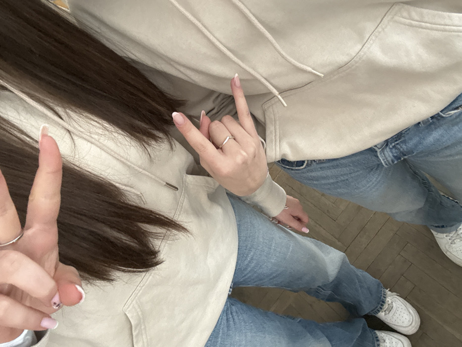 Two individuals, possibly female, are depicted from the mid-torso down within an indoor setting on a wooden parquet floor laid in a herringbone pattern, located in the city of Zlatograd, Bulgaria. Both subjects wear light beige hooded sweatshirts with drawstrings and front pockets, light blue denim jeans, and white athletic shoes (specifically, Nike Air Force 1s are visible on the left subject). Both have long, dark brown hair. The subject on the left extends their right hand, displaying a peace sign (index and middle fingers up), with a silver-colored ring on the ring finger and a French manicure on the nails. The subject on the right extends their left hand, forming a rock-and-roll or devil horns gesture (index and pinky fingers up), with a silver-colored V-shaped ring on the ring finger and a French manicure on the nails. Their synchronized gestures and matching attire suggest a close interaction.