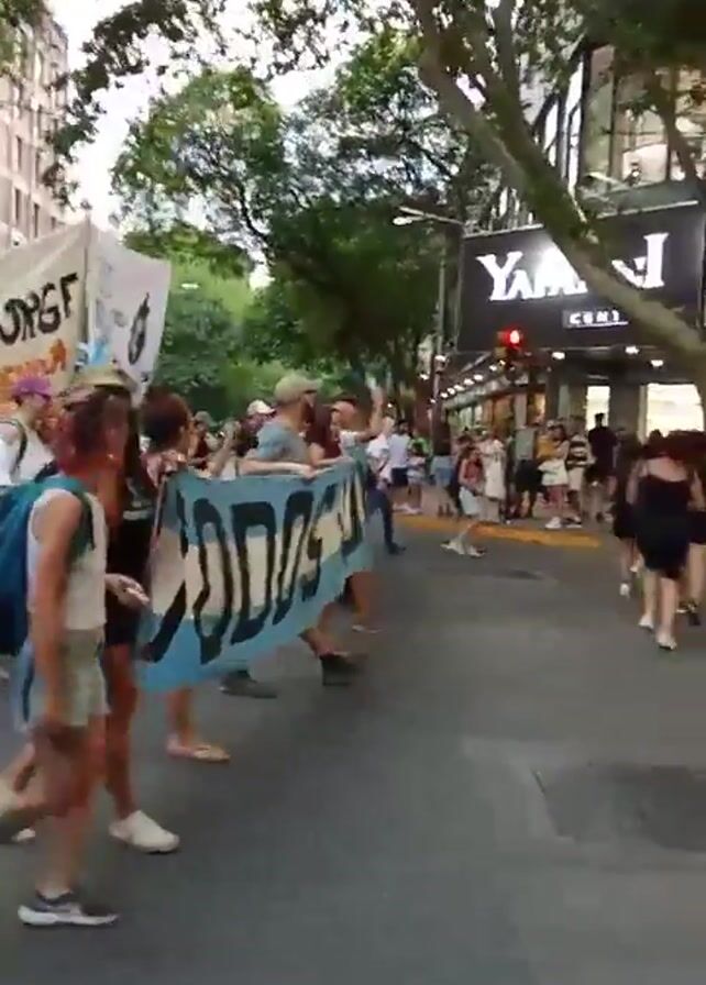A group of people is marching down a city street, holding a banner that appears to be in the colors of the Argentinian flag and has the word "TODOS" written on it. Other signs are visible, but the text is illegible. The marchers are of various ages and are dressed casually. Some are waving their arms and appear to be chanting or shouting. Other pedestrians are present on the sidewalks and in the background. The street is lined with buildings, some of which have retail stores. Trees line the street, providing some shade. The overall atmosphere suggests a protest or demonstration.