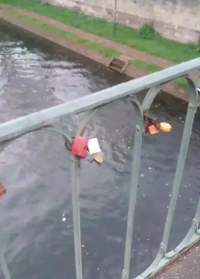 section of a bridge with a metal railing over a canal. A number of padlocks have been attached to the railing, seemingly as a symbol of love or commitment. The locks are of various sizes, colors, and materials. The canal has murky water with ripples and some floating debris. On the canal bank, there is a narrow strip of grass and a low brick wall. In the distance, a park-like area with bare trees and several people walking can be seen. The sky appears overcast. The camera is stationary and focuses on the locks and the water.