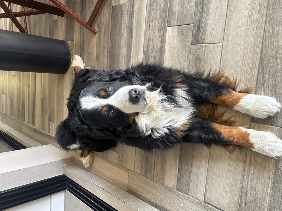 - "A Bernese Mountain Dog lies on its back, paws outstretched, on a tiled floor" by FM-vhRXA3, licensed under CC BY 4.0