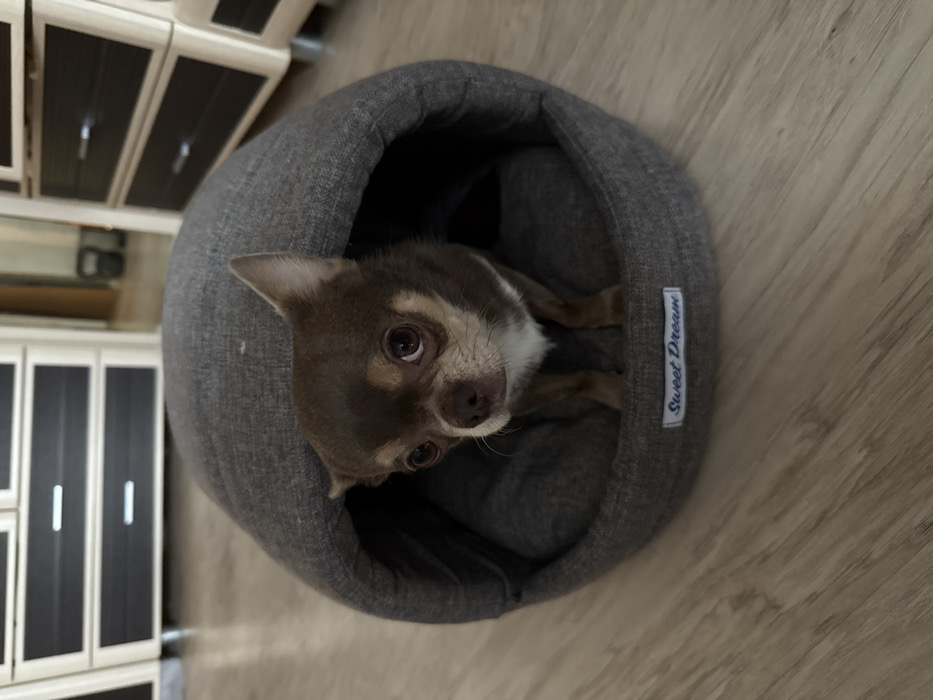 - "A small, short-haired Chihuahua dog, predominantly chocolate brown with tan facial markings and a white patch on its chest, stands partially inside a grey, semi-enclosed pet bed" by FM-UkYLp2, licensed under CC BY 4.0