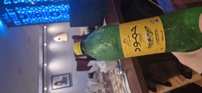 A hand holds a green bottle with a yellow label featuring Arabic text. The bottle appears to contain a beverage. The background includes a wall with decorative lighting and a framed picture. A table with a patterned surface and tissues is visible, along with maroon chairs. A dark screen is mounted higher on the wall. The overall setting suggests an indoor dining area.