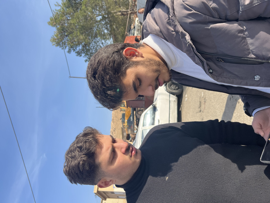 The scene depicts two young adult males outdoors in At-Tall, Syria, under a clear blue sky