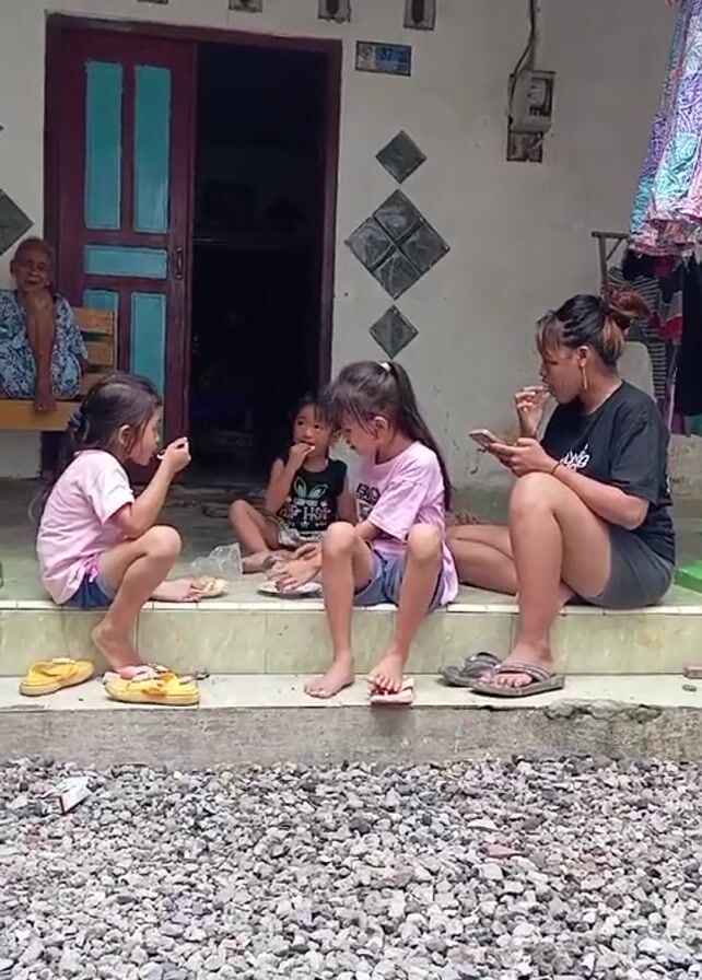 In front of a modest building with a white exterior and a dark-colored door, a group of individuals are gathered on the porch steps. Two young girls, dressed in pink shirts and shorts, sit barefoot and appear to be engaged in conversation while eating something. A younger child in a dark t-shirt sits between them, also eating. To the right of the children, a woman with her hair up sits and looks at her phone. An older woman sits on a wooden bench on the far left of the frame. A scattering of sandals are on the steps, and there is a plate of food between the girls. The porch is decorated with diamond-shaped patterns. In front of the porch, the ground is covered with small, grey rocks. A green plant is visible on the left side. A clothesline with some clothing hangs on the right side. Throughout the scene, the overall lighting suggests it is daytime.