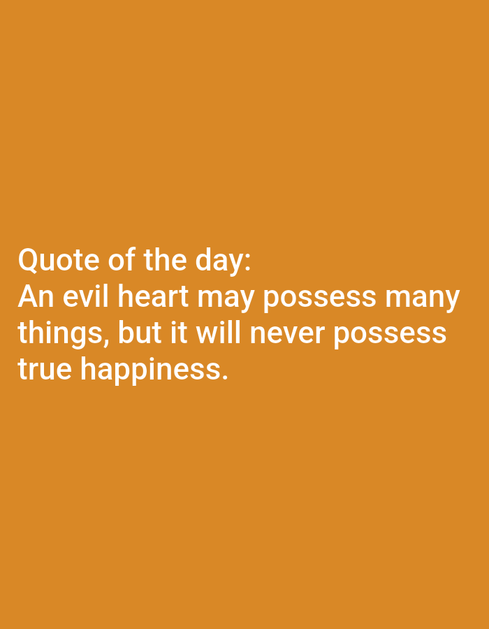The image displays a solid, uniform orange background. Centered horizontally and positioned in the lower half of the frame is white, sans-serif text. The text reads: "Quote of the day: An evil heart may possess many things, but it will never possess true happiness." No people, discernible physical objects, actions, or interactions are depicted. The environment consists solely of the described colored background. The image provides no visual information regarding a specific physical location, including the city of Novo Delchevo, Bulgaria.