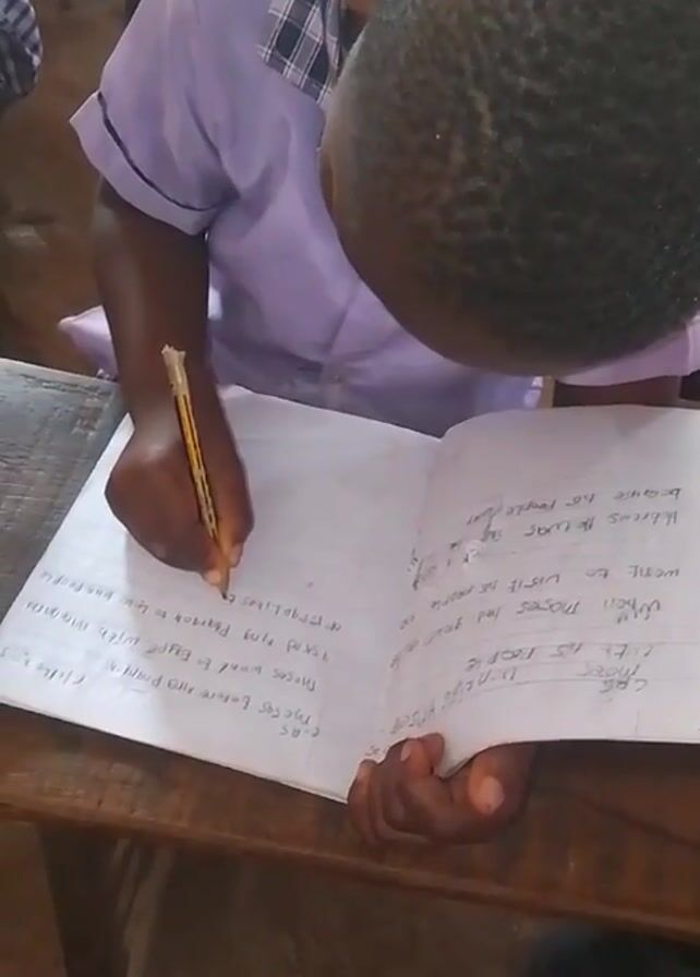 A young, dark-skinned child wearing a light purple school uniform is writing in a notebook with a pen